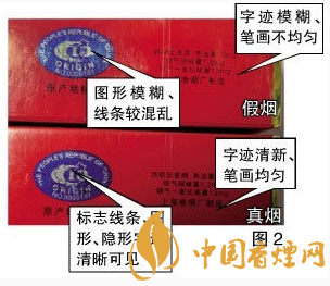 真品“中華”印刷套色準確,字跡清新、筆畫均勻,字樣邊緣呈細微的齒輪狀,而不是人們普遍認為的平滑狀。假煙字跡模糊、筆畫不均勻,字樣邊緣呈平滑狀。真品“中華”原產地標志采用中國地圖圖案,細看海南島和臺灣島為空心,在某些角度和光線下圖案背景會呈現(xiàn)“中華”字樣,標志線條、圖形、隱形字跡清晰可見。假煙原產地標志圖形模糊、線條較混亂。