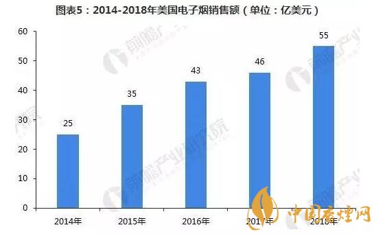 根據(jù)《2017年世界煙草發(fā)展報告》顯示,北美是第一大電子煙市場,而跟據(jù)貝倫貝格銀行發(fā)表的一份報告稱,美國已經(jīng)成為世界上新一代產(chǎn)品銷量最大的市場。2014-2017年,美國電子煙銷售額逐年增長,2017年增長至46億美元。而2017年全球電子煙銷售額約為100億美元,美國就占了近50%的市場份額。預計2018年美國電子煙銷售額將達到55億美元。