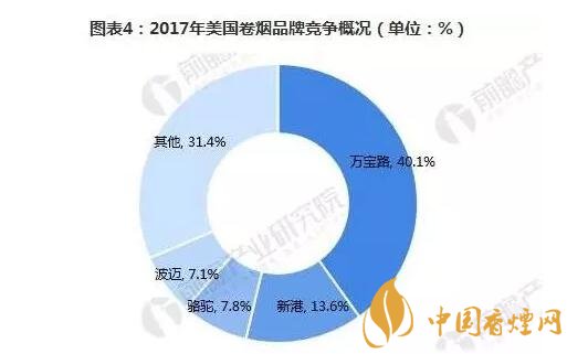 目前,美國市場上主要有四家大的卷煙制造商:菲莫國際、雷諾茲煙草公司、帝國品牌公司以及利格特邁爾斯煙草公司。2017年,菲莫國際在美國的市場份額為44.5%,較上年下降了2.1個百分點;雷諾茲煙草公司的市場份額為34.5%,同比上升0.8個百分點;帝國品牌公司市場份額增長了0.1個百分點,至8.9%;利格特邁爾斯煙草公司的市場份額增加了0.1個百分點,至3.7%。