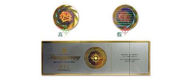 (2)看防偽標(biāo)記:條盒的正面芙蓉花防偽標(biāo)記,真煙的印刷在同一側(cè)面看到的只有一個(gè)圖樣;假煙的印刷在同一側(cè)面看到是幾個(gè)在一起的圖樣。