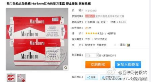 像之前在淘寶、京東上也有很多店鋪打著煙標收藏的幌子,銷售卷煙制品,不過所銷售的卷煙是真是假就不得而知了。隨著近年來相關部分監(jiān)督力量的加強,淘寶上也對違規(guī)銷售煙草制品的店鋪進行了處理,現(xiàn)在很少能找的到了。以上就是香煙網(wǎng)小編為大家整理介紹的關于網(wǎng)上買香煙去哪個網(wǎng)站針對介紹的網(wǎng)上買煙的正規(guī)網(wǎng)站相關信息,更多了解點擊:2018年香煙網(wǎng)購商城郵寄新規(guī)定:每人最多可買2條