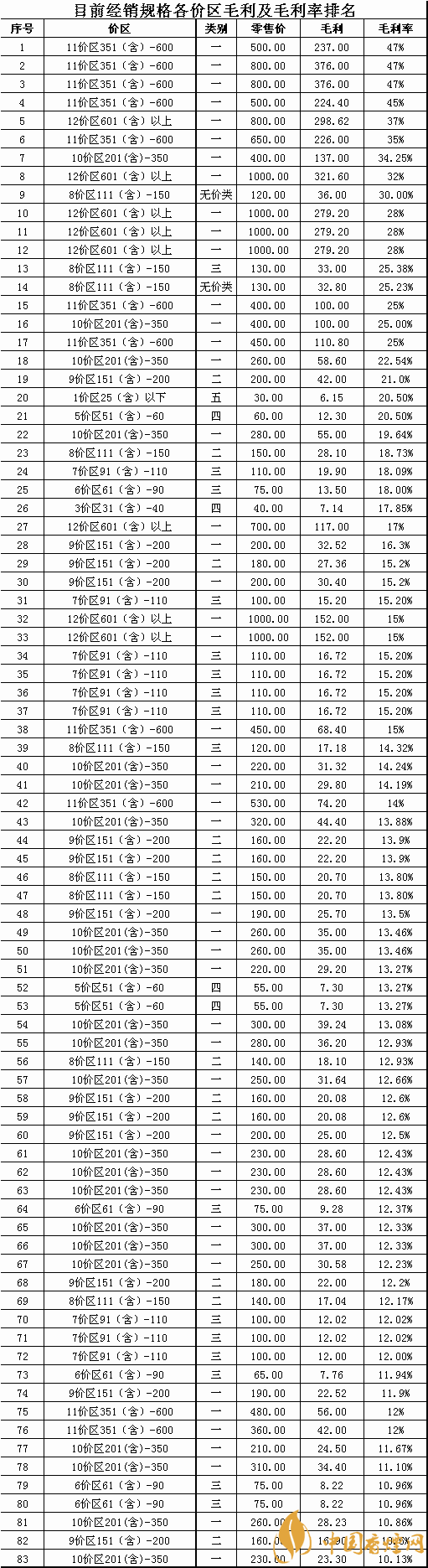 注:從目前全市經(jīng)銷的83個(gè)品牌批零差價(jià)可以看出,單品牌規(guī)格毛利率低于11%的僅有5個(gè)規(guī)格且全部高于10%的毛利率,部分溢價(jià)的規(guī)格產(chǎn)品毛利率已經(jīng)接近了50%,卷煙規(guī)格的平均毛利率達(dá)到了17.97%,然而這都預(yù)期的毛利,為什么真實(shí)的現(xiàn)狀是我們賺不到這應(yīng)該屬于我們自己的毛利率和毛利,是值得每一個(gè)卷煙經(jīng)營者深思和考慮的問題?為了保障大家的合法利益我們隱藏了商品名稱和商品編碼,有經(jīng)驗(yàn)的零售客戶對照價(jià)區(qū)和商品獲利水平就可以清晰的對商品進(jìn)行定位,具體對應(yīng)商品規(guī)格請參照2019版《卷煙零售客戶服務(wù)手冊》卷煙價(jià)格一覽表有詳解。