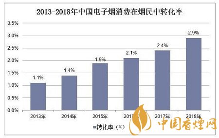 據(jù)統(tǒng)計,2018年中國電子煙消費在煙民中轉(zhuǎn)化率(新型煙草消費者占煙民比例)約為2.9%。