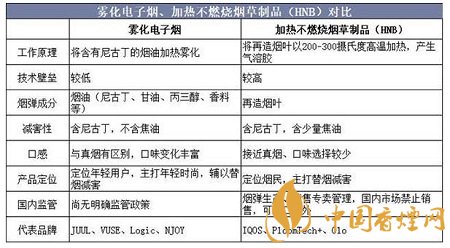 新型煙草是一種具備減害效果的尼古丁傳遞系統(tǒng),其煙氣中的有害物質(zhì),如焦油、一氧化碳等,含量遠低于傳統(tǒng)卷煙。新型煙草可分為霧化電子煙、加熱不燃燒煙草制品(HeatNotBurning,HNB)兩大類,其中霧化電子煙又包括封閉式(霧化室為封閉系統(tǒng),換彈式)和開放式(霧化室為開放系統(tǒng),注油式)兩種。霧化電子煙和HNB的差異性主要體現(xiàn)在工作原理、煙彈成分、產(chǎn)品定位等方面。