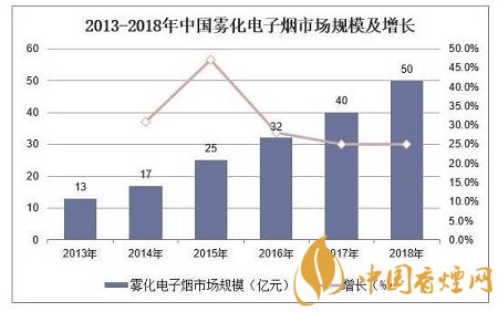 據(jù)統(tǒng)計,2013-18年國內(nèi)霧化煙市場規(guī)模CAGR為+30%,2018年國內(nèi)霧化電子煙市場規(guī)模約50億元,同比增長25%。