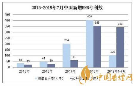 2016-2018年國內(nèi)HNB專利共計830件,其中2017年、2018年、2019年1-7月年新增HNB卷煙專利數(shù)(公開口徑)分別約為61件、355件、343件,技術推進加快。
