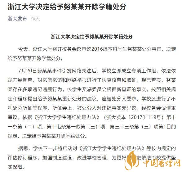 浙大表示,現(xiàn)已查實,努某某存在多項違紀違規(guī)行為。浙大學生獎懲委員會根據(jù)新查證的事實,按照相關規(guī)定和程序提出給予努某某重新處分的建議。應被處分人要求,學校還進行了不利處分聽證等程序。聽證會上,被處分人對違紀事實無異議。經(jīng)浙江大學校務會議慎重審議,依據(jù)《浙江大學學生違紀處理辦法》(浙大發(fā)本〔2017〕119號)相關規(guī)定,決定給予努某某開除學籍處分。