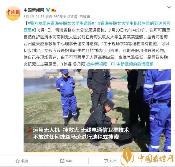 8月1日,青海格爾木市公安局通報,警方發(fā)現(xiàn)在青海失聯(lián)女大學(xué)生遺骸。7月30日19時許,在可可西里自然保護區(qū)清水河南側(cè)無人區(qū),黃某某身份證等物品被發(fā)現(xiàn)。警方勘查發(fā)現(xiàn)人體骨骼組織,經(jīng)DNA比對為黃某某遺骸。