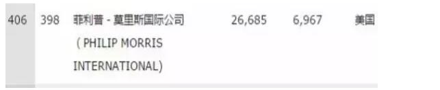 翻遍整個(gè)榜單,終于在末尾出發(fā)現(xiàn)了榜單唯一一家煙草公司--菲利普•莫里斯國際公司(簡稱菲莫國際,萬寶路就是它家生產(chǎn)的),以營收266.85億美元、利潤69.67億美元排名世界500強(qiáng)第406位。