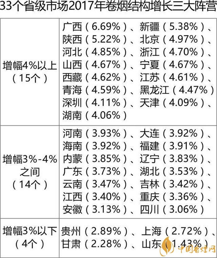 結(jié)構(gòu)升級既是行業(yè)所愿,也是大勢所趨。其中,有幾個值得進一步觀察的現(xiàn)象:一是單箱值邁入3萬元的省級市場已達15個,總體以華東、華南、西南兩大區(qū)域為主(北方只有北京市)。二是一類煙成為結(jié)構(gòu)提升的主動力,全年一類卷煙銷量1058.60萬箱,同比增加70.35萬箱,增長7.11%。三是有8個省級市場單箱結(jié)構(gòu)同比增加值沒有達到1000元,分別是山東、甘肅、吉林、貴州、遼寧、四川、內(nèi)蒙和黑龍江,其中,山東煙民消費最不給力,僅增加360元。四是結(jié)構(gòu)最高的仍然是浙江,單箱值達到43663元,最低的仍然是河北,單箱值為22375元,相差接近一倍。