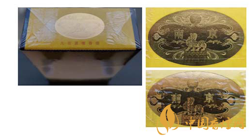 假冒卷煙:該款假冒卷煙南京字體邊緣金色輪廓線和筆畫內(nèi)無小圓點(diǎn),字體筆畫顏色暗淡,燙金套印有偏差。圖3上真下假