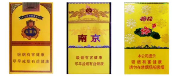 在中國傳統(tǒng)審美中,富貴金色是權貴階層的代表色彩,那么,高端香煙頻繁出現(xiàn)金色包裝就不足為奇了。2018卷煙流行色的從以下幾款就可以看出:例如,云煙(大重九)、南京(九五之尊)、鉆石(金一品荷花)等。