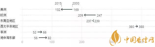 按世界衛(wèi)生組織所劃分地域的2015年與2000年吸煙人數(shù)變化對比: