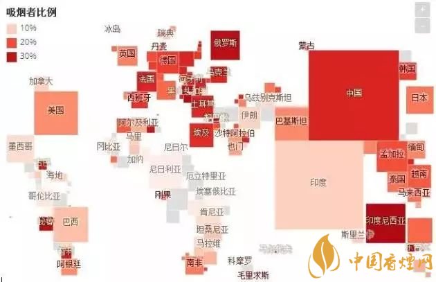 2016年,該國每天的煙草消費者即吸煙者占15周歲以上人口的百分比。各國均被標識為正方形,并可根據(jù)人口基數(shù)進行縮放,以便您更直觀地了解各國吸煙人數(shù)。