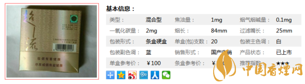 超低焦油低危害卷煙代表性產品。“中南海(1mg)”集中草藥添加、綜合降焦、納米1+1以及復合減害技術于一身,使焦油量降至1毫克/支,卷煙危害指數(shù)低至3。下面就由香煙網小編帶大家來了解一下中南海超1流的相關信息。