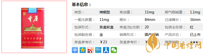 重慶紅香煙,煙長84mm,過濾嘴長:36mm,焦油量11mg,采用濾嘴通風技術(shù),有效降低了煙氣中有害物質(zhì)的含量,順應(yīng)了目前降焦減害的發(fā)展方向。味道醇淡順口,比較合口味,總得來說很不錯,煙燃燒很好,口感一般,偶爾抽抽還是可以。