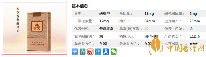 為進一步強化“金圣”的品牌特征,江西中煙將他們自主研發(fā)的第三代“金圣香”(中草藥添加劑)運用于“金圣”(典藏·本草香)的配方中,煙氣更加飽滿協(xié)調(diào)、更具層次感。下面我們一起來看看它的參數(shù)信息:焦油量11mg,煙堿量1mg,一氧化碳量12mg.