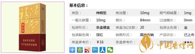 | 類型 :烤煙型 | 焦油量 :10mg | 煙氣煙堿量 :1mg | 一氧化碳量 :10mg |