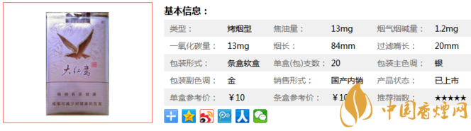 | 類型 :烤煙型 | 焦油量 :13mg | 煙氣煙堿量 :1.2mg | 一氧化碳量 :13mg |