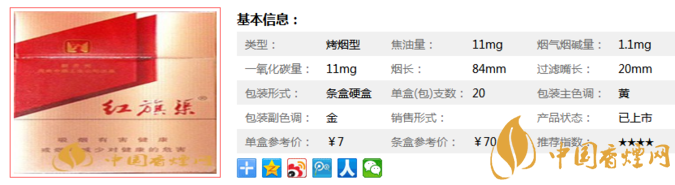 | 類型 :烤煙型 | 焦油量 :11mg | 煙氣煙堿量 :1mg | 一氧化碳量 :11mg |
