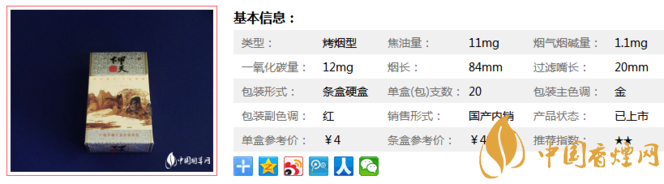 | 類(lèi)型 :烤煙型 | 焦油量 :11mg | 煙氣煙堿量 :1.1mg | 一氧化碳量 :12mg |