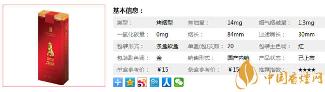 | 類型 :烤煙型 | 焦油量 :14mg | 煙氣煙堿量 :1.3mg | 一氧化碳量 :14mg |