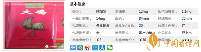 大雞富貴味道比較醇厚,但是新品大雞總感覺欠缺點什么,但也品不出原來大雞煙的味道,也就包裝有些懷舊。大雞這個煙,名字好,含義好,大吉大利,06年退市,現(xiàn)在又重出江湖了。經(jīng)香煙網(wǎng)小編市場調(diào)查大雞富貴售價為3元/包。