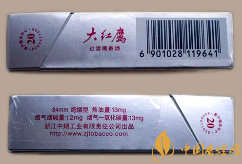 大紅鷹精品香煙,煙支長84mm,濾嘴長20mm,點燃,煙只的吃味平滑,香氣飄逸順暢、口感略淡,不知和降焦有沒有關(guān)系?;匚稁缀醺杏X不到。下面我們一起來看大紅鷹銀的參數(shù)信息:焦油量:13mg. 煙堿量:1.2mg. 一氧化碳量:13mg.