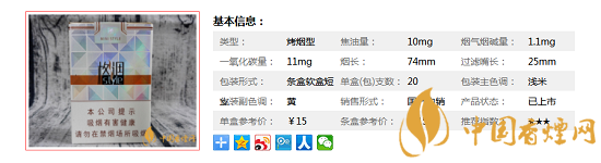 | 類型 :烤煙型 | 焦油量 :10mg | 煙氣煙堿量 :1.1mg | 一氧化碳量 :11mg |