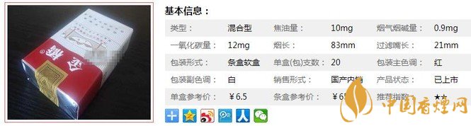 | 類(lèi)型 :混合型 | 焦油量 :10mg | 煙氣煙堿量 :0.9mg | 一氧化碳量 :12mg |