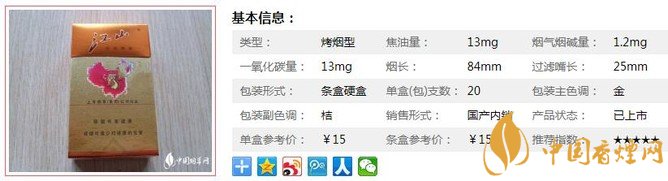珍品江山——烤煙型,84mm硬盒,分?jǐn)?shù)段A上。江山牌卷煙單支煙氣中有害成分比普通卷煙減少50%以上。降焦之后口感稍微淡了一點(diǎn),原來(lái)的中藥調(diào)香似乎少了一些,但并不影響總體的口味。下面我們一起來(lái)看江山珍品的參數(shù)信息:焦油量:13mg. 煙堿量:1.2mg. 一氧化碳量:13mg.