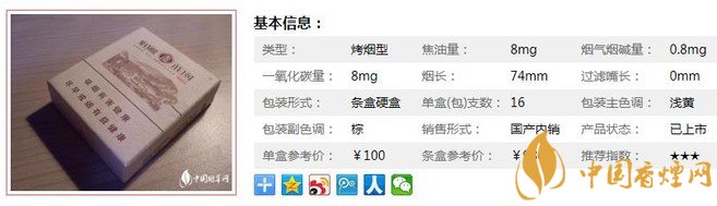 | 類型 :烤煙型 | 焦油量 :8mg | 煙氣煙堿量 :0.8mg | 一氧化碳量 :8mg |