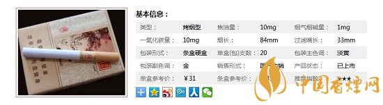 | 類型 :烤煙型 | 焦油量 :10mg | 煙氣煙堿量 :1mg | 一氧化碳量 :10mg |