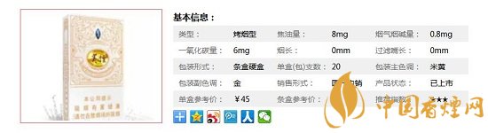 | 類型 :烤煙型 | 焦油量 :8mg | 煙氣煙堿量 :0.8mg | 一氧化碳量 :6mg |