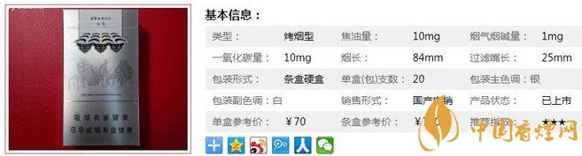 | 煙長(zhǎng):84mm | 過(guò)濾嘴長(zhǎng):25mm | 包裝形式:條盒硬盒 | 單盒(包)支數(shù):20 |