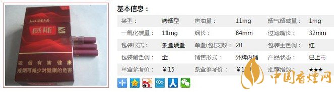| 類型 :烤煙型 | 焦油量 :11mg | 煙氣煙堿量 :1mg | 一氧化碳量 :11mg |