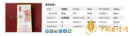 | 類型 :烤煙型 | 焦油量 :8mg | 煙氣煙堿量 :0.8mg | 一氧化碳量 :8mg |