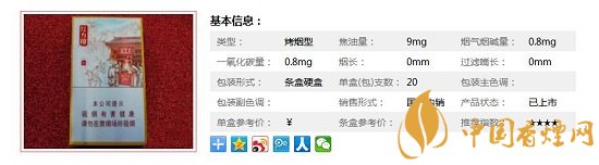 一盒20支,煙長94mm,焦油量9mg,煙堿量0.8mg,一氧化碳量9mg