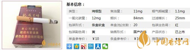 | 類型 :烤煙型 | 焦油量 :11mg | 煙氣煙堿量 :1.1mg | 一氧化碳量 :12mg |
