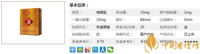 | 類型 :烤煙型 | 焦油量 :10mg | 煙氣煙堿量 :1mg | 一氧化碳量 :10mg |