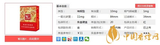 | 類(lèi)型 :烤煙型 | 焦油量 :10mg | 煙氣煙堿量 :1mg | 一氧化碳量 :11mg |