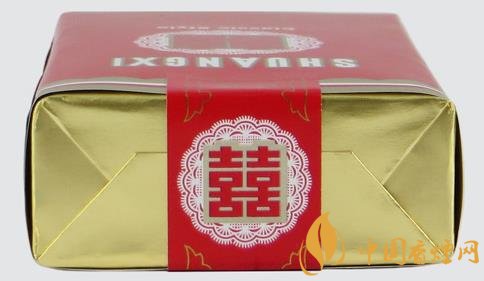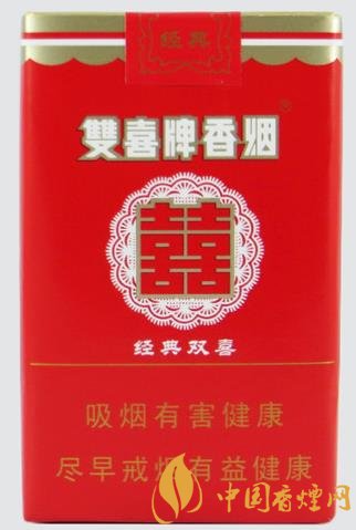 正面剪紙圖花潔白,“喜喜”則浮貼其上,嵌以金邊,喜氣洋洋。上為中文商標(biāo)“雙喜牌香煙”,下有“經(jīng)典雙喜”字樣,金線之下為大警語(yǔ)。煙支入眼,樸素清秀,豎紋煙紙上印有紅色“喜喜”,金葉兩側(cè)環(huán)繞,下有“01”字樣。濾嘴稍短,下鑲金圈,整體感覺有種典雅之秀氣。