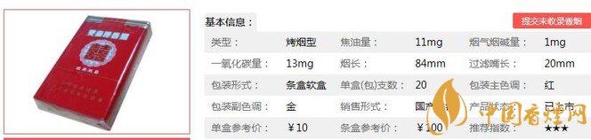 | 類型 :烤煙型 | 焦油量 :11mg | 煙氣煙堿量 :1mg | 一氧化碳量 :13mg |