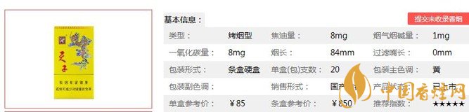 | 類型 :烤煙型 | 焦油量 :8mg | 煙氣煙堿量 :1mg | 一氧化碳量 :8mg |