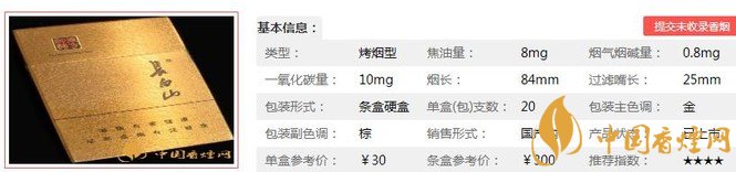 | 類型 :烤煙型 | 焦油量 :8mg | 煙氣煙堿量 :0.8mg | 一氧化碳量 :10mg |