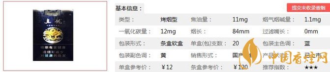 | 類(lèi)型 :烤煙型 | 焦油量 :11mg | 煙氣煙堿量 :1.1mg | 一氧化碳量 :12mg |