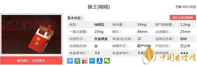 以上便是由香煙網(wǎng)小編為大家介紹的關(guān)于猴王咖啡價(jià)格表一覽 煙氣飽滿余味干凈的相關(guān)信息,想要了解更多有關(guān)內(nèi)容請(qǐng)點(diǎn)擊:猴王軟藍(lán)價(jià)格及參數(shù) 陜西低價(jià)煙中的佼佼者