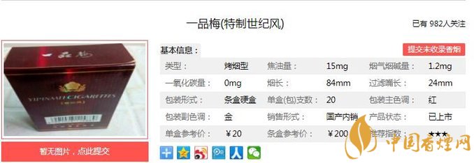 品梅世紀風煙氣甜韻圓潤、柔綿舒適、入喉清新豐滿、順暢、醇綿、飽滿、輕靈,此煙還是很不錯的,口感著實純正飽滿,醇厚干凈。經(jīng)香煙網(wǎng)小編市場調(diào)查一品梅世紀風售價為20元/包。