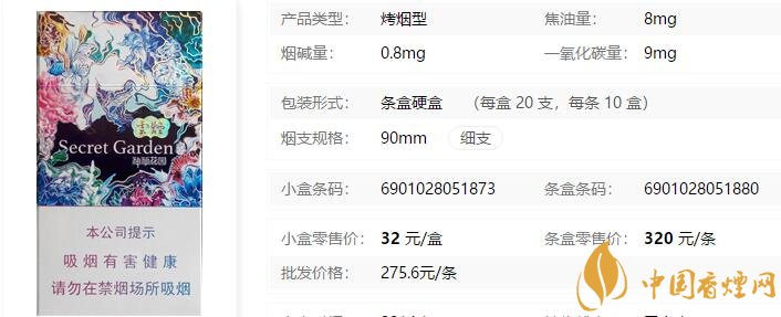 云煙(神秘花園)煙支長:90mm,烤煙型,包裝形式:條盒硬盒(每盒 20 支,每條 10 盒)。超細(xì)支的整體形式更凸顯產(chǎn)品的細(xì)致、優(yōu)雅、個(gè)性獨(dú)一,整個(gè)版面色調(diào)以紫羅蘭色為基礎(chǔ)色,藍(lán)、紅色為其點(diǎn)綴,凸顯設(shè)計(jì)的高貴、神秘。下面我們一起來看云煙(神秘花園)的參數(shù)信息:焦油量:8mg 煙堿量:0.8mg 一氧化碳量:9mg