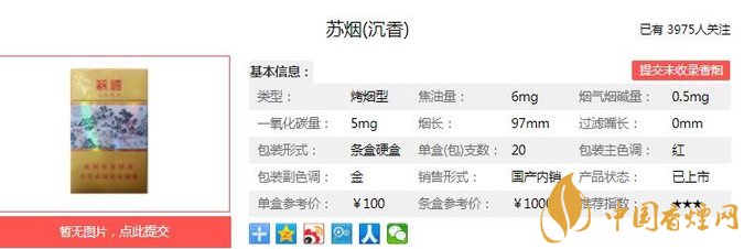 蘇煙沉香,其價(jià)位應(yīng)該是細(xì)支香煙中最高的品牌香煙。蘇煙沉香香氣優(yōu)雅協(xié)調(diào),沉香香氣獨(dú)特、高雅,且與煙草本香完美融合,煙氣細(xì)膩,濃度和勁頭適中、口感舒適生津。經(jīng)香煙網(wǎng)小編市場調(diào)查蘇煙沉香售價(jià)為100元/包。